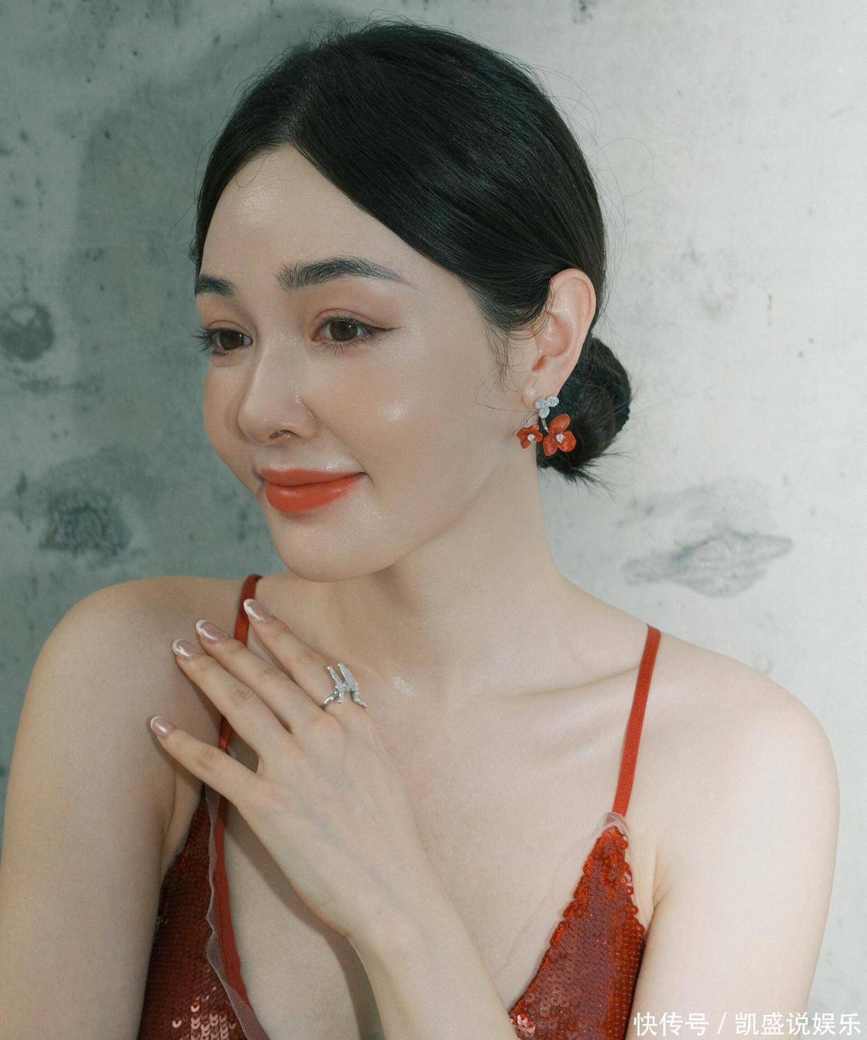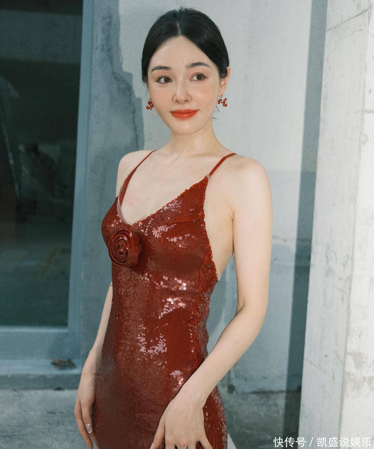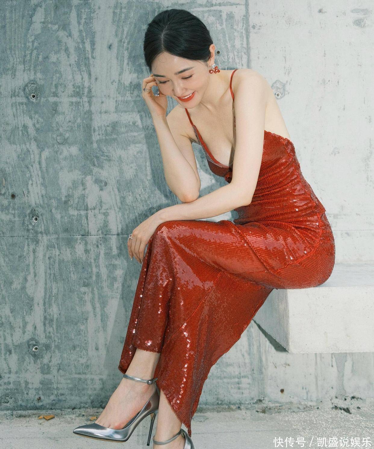 重点说说这裙子的 “小心机”:深 V 领刚好卡在锁骨下两指,既不越界又把肩颈线拉得跟天鹅似的,裙摆开叉到大腿根,踩银色高跟鞋时腿一抬,那弧度直接把 “性感” 俩字写脸上。而且这亮片不是普通货,是那种会随角度变光泽的料子,走动时跟裹了层流动的红光似的,难怪造型师说这是 “把星河缝在裙子上”。插个八卦:这姐们儿私下是个 “狠人”—— 去年为了演投行精英,硬是把自己塞进高跟鞋练了两个月仪态,现在穿这细带裙,肩都没塌过一秒。之前看她《浮图缘》里演李美人,还是柔柔弱弱的样子,结果一换礼服直接气场两米八,这 “剧抛型身材” 谁看了不佩服?最后总结:这造型能出圈,一半是裙子选得妙,一半是她把 “细节控” 焊在身上 —— 比如指间那枚蝴蝶戒指,翅膀刚好衬得手更纤细,耳环选同色系小花款,既不抢裙子风头又能点睛。建议各位兄弟把这组图存成 “穿搭教科书”,以后看女星红毯就知道:真正的美,是把 “艳” 和 “雅” 捏得刚好。
